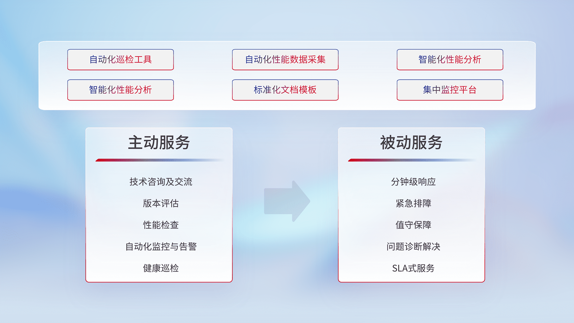智能化工具和标准化文档,,,,保障服务质量,,,,提供主动服务(包含技术咨询、、、版本评估、、、性能检查、、、、自动化监控与告警、、健康巡检)和被动服务包含(分钟级响应、、紧急排障、、、值守保障、、问题诊断解决、、、、SLA服务)。。。